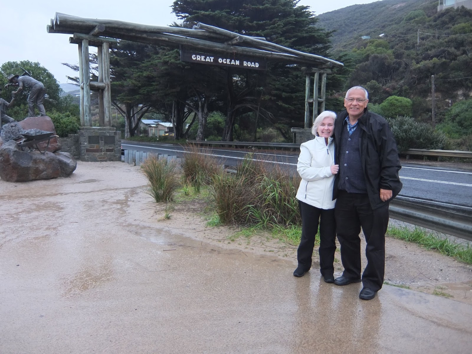 A little over 4 years after leaving Apollo Bay to drive Great Ocean Road with Tiia, I returned in the dead of winter with Mom and Dad. On the Solway Lass there was a couple from Melbourne who had said the city was experiencing a mild winter, so we were hoping for cool, sunny days. Flying from Hamilton Island, we arrived after lunch to grey skies and rain. We found our rental car and with Dad as navigator and me in the driver's seat, we managed to successfully exit the airport and find our way onto the Princes Freeway. We decided to stop for lunch in Geelong before continuing to Torquay, the official start of Great Ocean Road. Unfortunately it continued to rain steadily all afternoon, which made our drive not as scenic as I had thought it would be. I had been on this stretch of Victorian coastline several times before and loved it, but I was sad that Mom and Dad were missing out. I insisted we get out for the photo opportunity under the Memorial Archway, built as a tribute to soldiers from the First World War. We then continued on to Lorne, where we stopped to pick up some groceries before driving the final 43 kilometres to Apollo Bay in the dark. We were almost home.